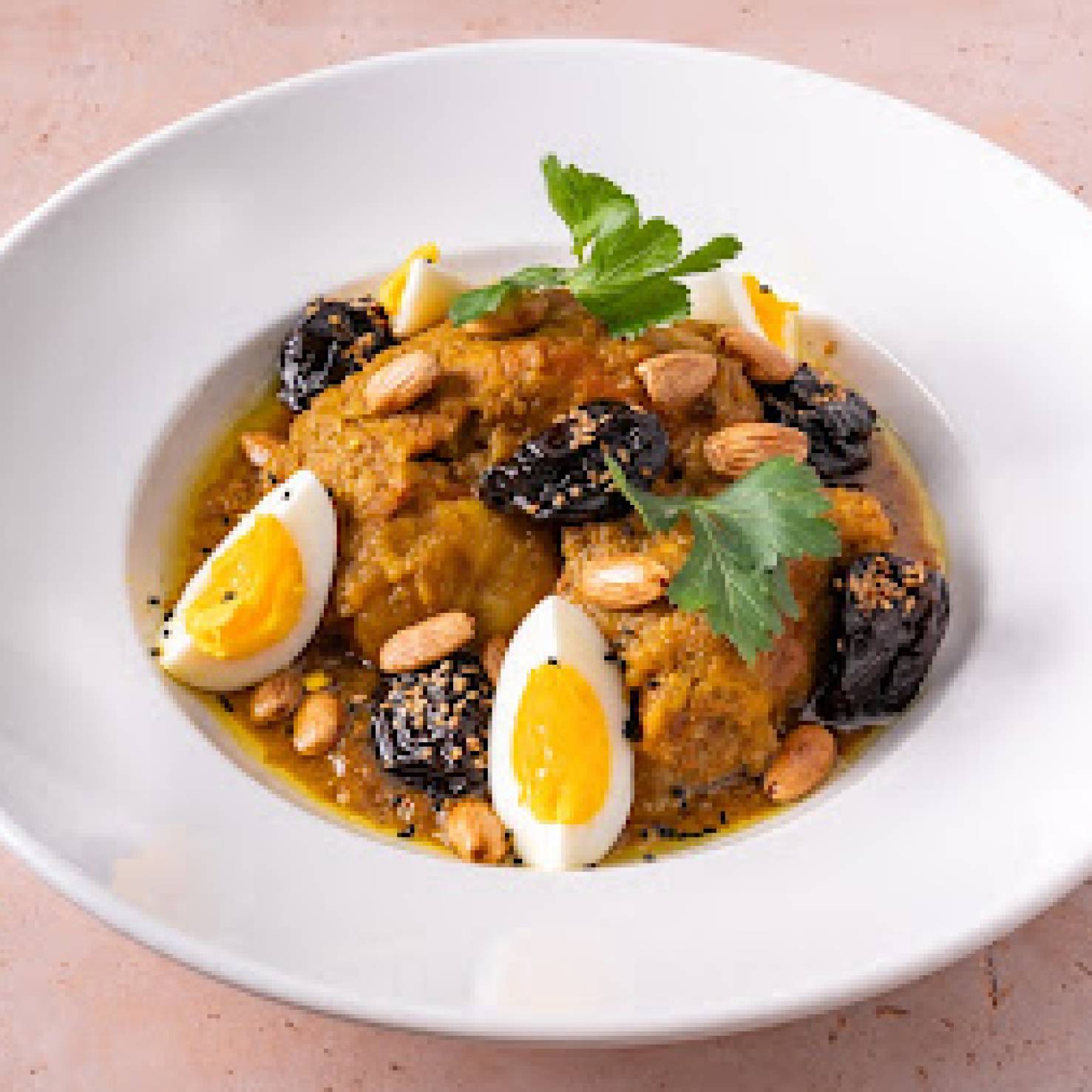 Cuisse de Poulet mijoté aux lentilles et aux épices marocaines, servi sur un lit de msemen effiloché, délicatement parfumé au fenugrec et au ras el hanout. Un plat convivial et authentique, symbole des grandes occasions